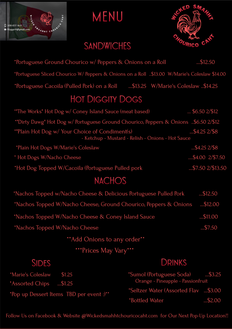THE IDEA BEHIND THE “WICKED SMAHHT CHOURICO CAHT” ALL STARTED FROM MY OWN PERSONAL JOURNEY LEAVING BEHIND MY ORIGINS IN FALL RIVER, MASSACHUSETTES, FOR A FRESH START IN PORTLAND,MAINE. FALL RIVER BOASTS A SIGNIFICANT PORTUGUESE HERITAGE AS IT IS WHERE MANY IMMIGRANTS FROM THE AZORES SETTLED; FALL RIVER IS COMMOMLY REFERRED TO AS “LITTLE PORTUGAL”, AS THE PORTUGUESE CULTURE LIVES ON THROUGH THE CITY’S UNIQUE FOOD, FESTIVALS,AND LANGUAGE. FALL RIVER IS ALSO KNOWN FOR ITS FAMOUS CONEY ISLAND HOT DOG. IT IS A HOT DOG SERVED WITH MUSTARD, CONEY SAUCE (a ground beef base, not containing beans, that is much looser than a chili consistency),AND FINELY CHOPPED ONION; RESIDENTS KNOW THIS STYLE DOG BY ORDERING THEM “WITH THE WORKS”.